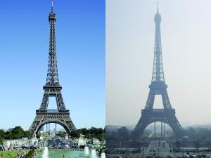 进入3月以来,巴黎及其周边地区一直无风少雨,PM2.5和PM10指数连续多日严重超标。该拼版照片显示的是分别拍摄于2014年3月14日(右)和2012年8月17日(左)的法国巴黎埃菲尔铁塔。新华/法新