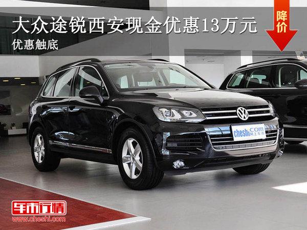 近日,据网上车市西安分站编辑从西安地区进口大众4S店获悉,现在购买进口大众途锐最高将可获得13万元的现金优惠。有意者不妨致电经销商或者到店了解更多信息。