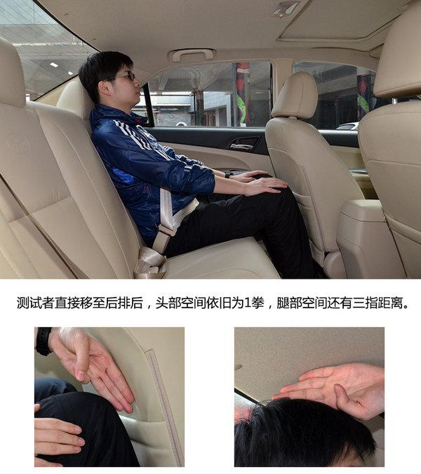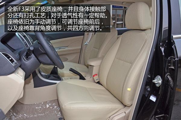 全新F3采用了皮质座椅,并且身体接触部分还有打孔工艺,对于透气性有一定帮助。座椅依旧为手动调节,可调节座椅前后,以及座椅靠背角度调节,共四方向调节。F3后排座椅头枕采用了一体式头枕,无法调节,同时后排座椅靠背与老款一样依旧无法放倒。经过测试者对F3车内的测试,基本能够满足日常家庭使用,空间表现出色。