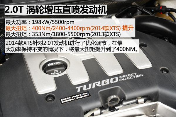 2014款XTS 28T包括铂金版依旧采用2.0T SIDI直喷涡轮增压发动机,但是动力有所升级,在功率不变的情况下,将最大扭矩调整至400牛米,比之前的353牛米提升了47牛米,而转速区间也相对延后和缩小,这样的做法就将油耗和加速都能很好的兼顾。与之匹配的依旧是6速手自一体变速器,运动模式需要将排挡杆拨至M档,仪表盘会显示档位的变化。