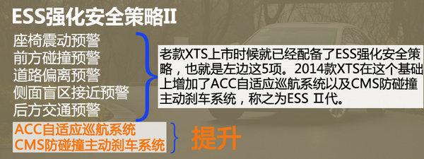 我们在老款XTS上已经体验到了“ESS强化安全策略”,最明显的就是通过震动座椅来警示车道偏离和前方碰撞等危险状况,在其他级别车型中这种座椅震动方式非常少见,而且,当你适应了这种方式之后,感觉要比其他的警示作用更加直观。2014款XTS升级为第二代系统,加入“全车速自适应巡航”和“主动刹车系统”。巡航状态下,XTS可通过雷达跟随前车速度,自动调节快慢缓急,紧急情况下甚至直接刹停,最大程度的降低乘员伤害。
