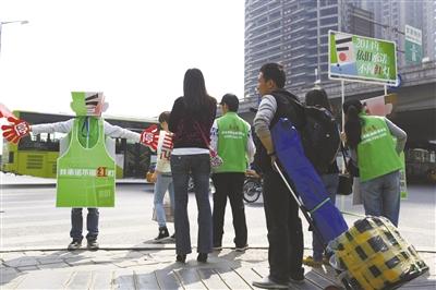 昨日,朝阳区大望路路口,志愿者向行人宣传“不闯红灯”。记者 浦峰 摄