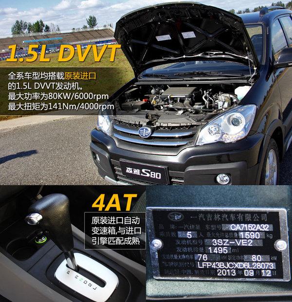 森雅S80全系车型均搭载原装进口的1.5L DVVT发动机。该款发动机采用连续可变气门正时技术,使其拥有1.6L的动力却只有1.3L的油耗。发动机最大功率为80KW/6000rpm,最大扭矩为141N.m/4000 rpm。虽然这款发动机排量为1.5L,但动力性能优于其他厂家1.6L发动机。
