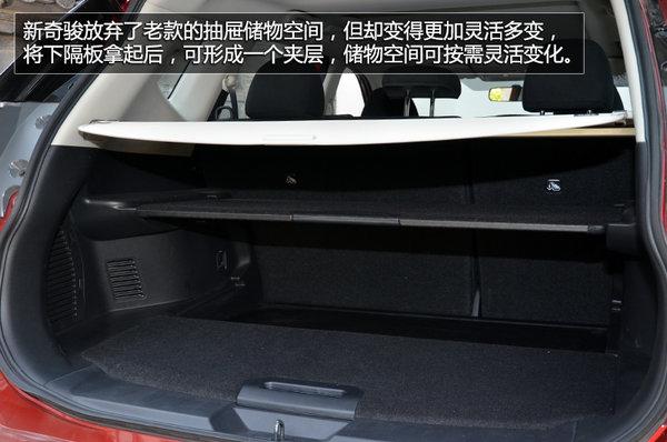 在空间方面,首先我们要去说的就是乘坐空间,乘坐离不开座椅,而全新奇骏的座椅采用与新天籁相同的零重力座椅,可惜的是我试驾的车型并不是真皮材质,而是织物。它的后排座椅在设计时就将高度定的比前排要高,这样可以让后排乘客获得更好的视野感受。而后备箱空间上我认为并没有老款更加出色,不过空间灵活度上却有了很大的进步。(刘学)