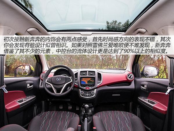 初次接触新奔奔的内饰会有两点感受,首先时尚感方向的表现不错,其次你会发现有些设计似曾相识。如果对照雪佛兰爱唯欧便不难发现,新奔奔借鉴了其不少的元素,中控台的流体设计更是达到了90%以上的相似度。