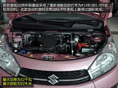 新款奥拓采用代号为K10B1的1.0升全铝发动机,最大功率为52千瓦,最大扭矩为92牛米,此款发动机曾经在燃油经济性表现上赢得过国际奖项。与之匹配一台4挡自动变速箱,在确保平顺性的同时也保证燃油经济性能。