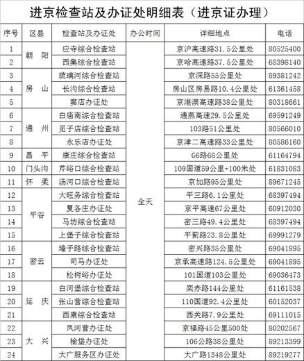 一是关于办理进京通行证:外省、区、市机动车需进入六环路(不含)以内道路行驶的,全市24个进京检查站或办证处全天24小时(法定节假日无休)为百姓办理进京证。办证时应提供六种证明材料: