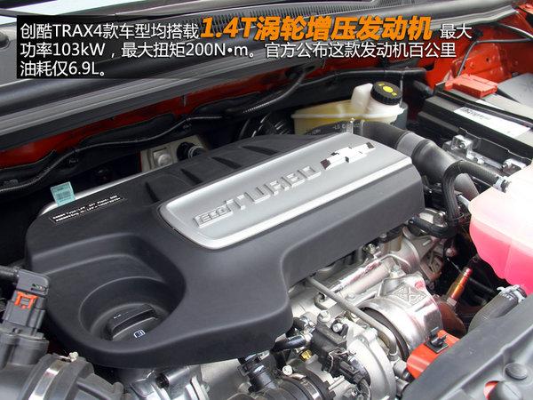 创酷TRAX全系4款车型均搭载1.4T涡轮增压发动机 最大功率103kW,最大扭矩200Nm。官方公布这款发动机百公里油耗仅6.9L。变速器方面有两种选择,最低配搭载了6速手动变速箱,其余三款车型则都为6速手自一体变速箱。