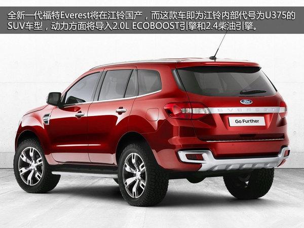 全新一代福特Everest将在江铃国产,而这款车即为江铃内部代号为U375的SUV车型,动力方面将导入2.0L ECOBOOST引擎和2.4柴油引擎。基于福特Ranger皮卡的底盘改进而来,大量继承了Ranger的造型元素,相比老款Everest,新车造型更加柔和,多了几分时尚和运动越野。国产版Everest轴距将达2850mm,车身接近5m,提供7座车型,直接将竞品锁定为普拉多。
