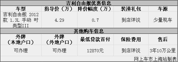 上海:吉利自由舰现优惠让利0.7万元 少量现车