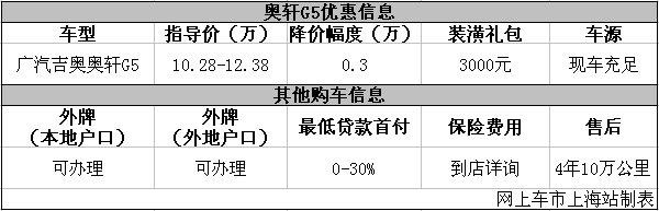 上海:吉奥奥轩G5现金0.3万 送3000元装潢