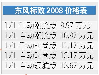 4月17日,预热许久、悬念只剩下价格的东风标致2008在北京正式上市,共有五款车型,最低9.97万元,最高13.67万元,这虽然没有大幅低于此前10万~14万元的预售价,但也没让“标粉”们失望,在可接受的范围之内。为表示诚意,东风标致为用户提供一“提升”方案,部分型号加5000元,可加装原厂的真皮座椅和3D导航,具体可咨询当地经销商。