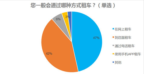 本次汽车之家研究中心的调查中,在问及用户对租车方式的偏好时,有47%曾经租过车的用户表示自己通过网上预定的方式租车,其次为直接到店面租车。可见,随着互联网及移动互联网的普及,在线租车超过店面租车成为用户最常选择的渠道。