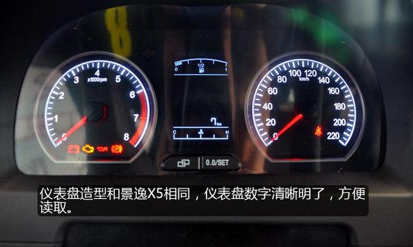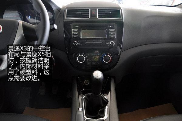 景逸X3依旧延续了X5的鸥翼式对称设计,样式简洁大方,按钮较少并且排列十分整齐,中控台大体采用了硬质塑料材质,操作面板则为钢琴烤漆材质,空调出风口均加以银色镀铬装饰条,为黑色内饰提色不少。