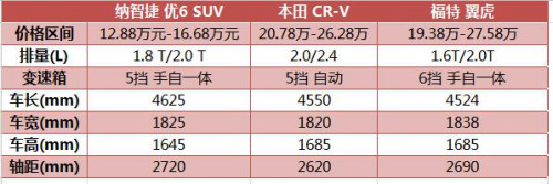 作为紧凑型SUV,纳智捷 优6长宽高分别为4625/1825/1600mm,轴距则达到2720mm。与竞品相比,2720mm的轴距比本田CR-v多100MM,保证车内舒适的驾乘空间。后备厢标准容积405升,放倒后排座椅后可扩展至1150升。后排乘坐是优 6 SUV的巨大优势,腿部、膝部空间阔绰,后排乘客足以翘起二郎腿。横向空间也很充裕,且后排中央地台没有鼓包,后排可以舒适乘坐三名成年人。而后排头部空间,并未受斜背的造型影响,依旧拥有970mm,身高180cm的乘客可以方便就坐,丝毫不会压抑。
