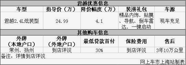 参与互动(0)日前网上车市上海站从上海冠松汽车销售服务有限公司了解到,目前该店君越2.4L炫装版车型优惠出售,详情请见下表: