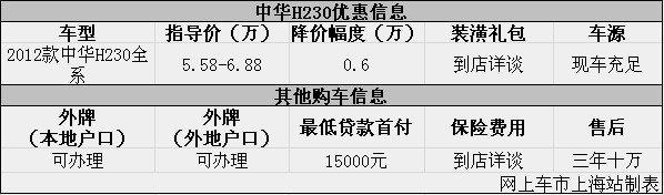参与互动(0)日前网上车市上海站从上海华星鸿华4s店了解到,目前该店中华H230优惠出售,详情请见下表: