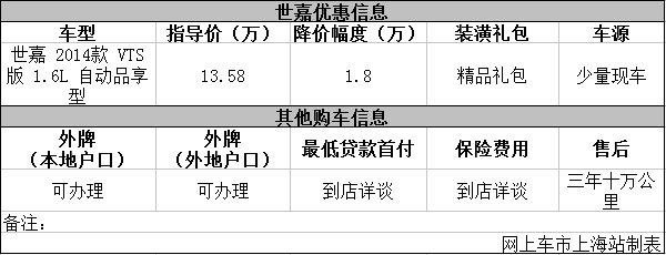 参与互动(0)日前网上车市上海站上海万通汽车汽车销售服务有限公司了解到,目前该店世嘉优惠出售,详细请见下表: