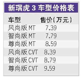5月15日,奇瑞新款瑞虎3正式上市,别激动,这并不是北京车展上亮相的新一代瑞虎3概念车的量产版,没这么快,这次上市的新瑞虎3只是一次大改款,并非换代产品,仍然采用1.6DVVT发动机,搭配5速手动或7速CVT变速器。新瑞虎3共有风尚版、智尚版、尊尚版在内的6款车型,售价7.39万~9.59万元。