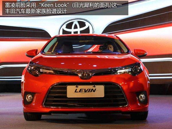 雷凌前脸采用“Keen Look”(目光犀利的面孔)这一丰田汽车最新家族脸谱设计。立体上扬的投射式前大灯组合,好似北美白头海雕的双眼,犀利、敏锐,炯炯有神。一条醒目、张扬的镀铬亮条从徽标向两边散发开去,强化了雷凌醒目、张扬的前脸特征。梯形大嘴下格栅设计,进一步营造出锐动感。