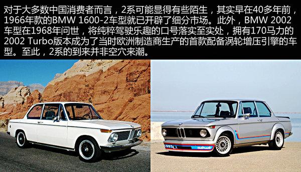 对于多数中国消费者而言,2系可能显得有些陌生,其实早在40多年前,1966年款的BMW1600-2车型就已开辟了细分市场。此外,BMW 2002车型在1968年问世,将纯粹驾驶乐趣的口号落实至实处,拥有170马力的2002 Turbo版本成为了当时欧洲制造商生产的首款配备涡轮增压引擎的车型。至此,2系的到来并非空穴来潮。