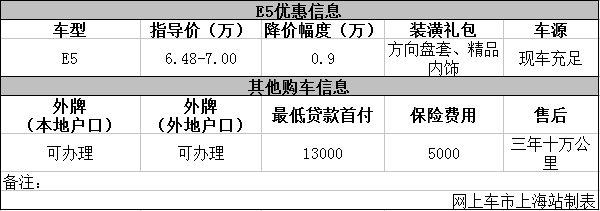 参与互动(0)日前网上车市上海站从上海瑞杰奇瑞4S店了解到,目前该店E5优惠出售,具体信息见下表: