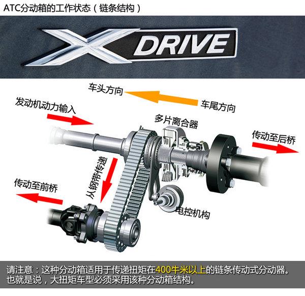 xDrive全轮驱动系统的核心技术是由奥地利的马格纳·斯太尔研制的分动器,以对扭矩分配进行不间断地调节。xDrive系统根据道路情况不断改变扭矩的分配,向前后车轮传输各自所需要的扭矩,默认状态下前后扭矩分配为40:60,最大前后扭矩分配理论上比例为0:100到100:0之间。该系统还不断与动态稳定系统DSC交换信息,从而可以从一开始就识别到车轮打滑。扭矩分配可以在0.1秒内完成。