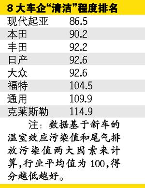 近日,美国非赢利性质的非政府组织忧思科学家联盟(简称“UCS”)发布了一篇关于汽车厂商“干净”程度的报告。UCS对2013年在美销量排名前八位的车企进行了评估,对其在2012年10月~2013年9月间销售的车型,根据燃油经济性、二氧化碳排放量等指标来评估企业整体的“干净”程度。结果令人意外的是,韩国现代-起亚集团拔得头筹,而美国“三大”——通用、福特、克莱斯勒“全军覆没”,不仅垫底榜尾,而且成绩均在行业平均值以下。
