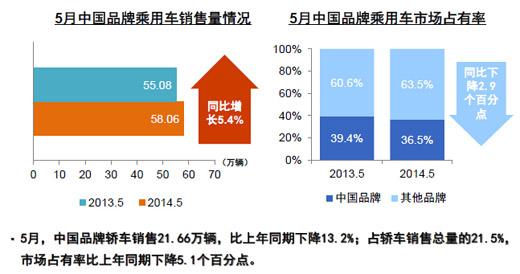 5月,中国品牌轿车销售21.66万辆,比上年同期下降13.2%;占轿车销售总量的21.5%,市场占有率比上年同期下降5.1个百分点。1-5月,中国品牌轿车销售116.04万辆,比上年同期下降15.8%;占轿车销售总量的22.5%,占有率比上年同期下降5.7个百分点。