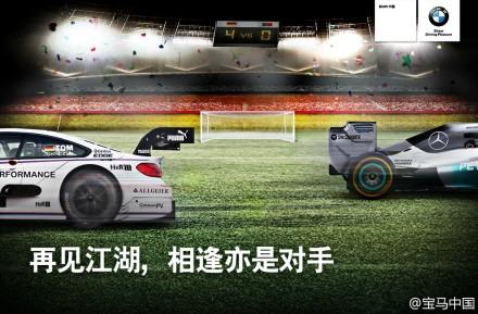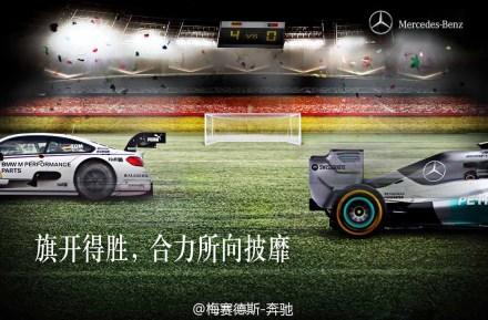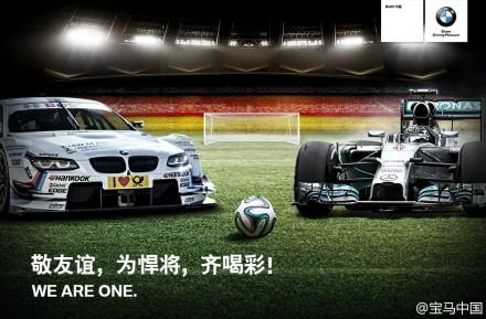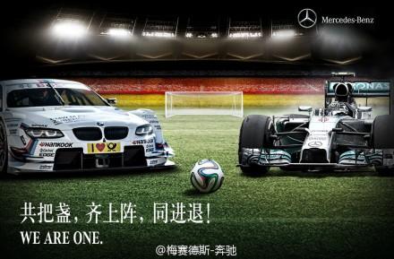 就在德国队与葡萄牙队比赛开始之前,宝马和奔驰的官方微博在22:47分,同时发表微博,前者的主题词为:“敬友谊,为悍将,齐喝彩”,后者的主题词为:“共把盏,齐上阵,同进退”,并用相同的配图,展示宝马和奔驰旗下的赛车车型。更为甚者,双方的微博分别在图片左下角标出:we are one!
