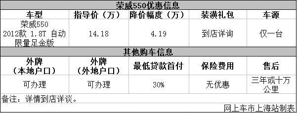 上海:2012款荣威550优惠41900元 仅一辆现车