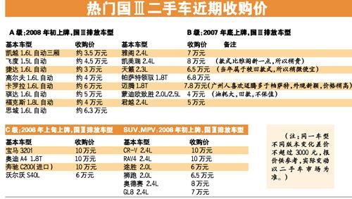A级车中,大多收购价以3万~5万元为主,如三厢凯越1.6L收购价只有3.5万元、广州人喜欢的两厢飞度1.6L车型收购价也只有4.5万元左右,仍维持较高收购价的车型只有卡罗拉和思域,能突破6万元,当然也比当年这两款车的身价跌了近2/3。国Ⅲ以下B级车的收购价显然更加“惨不忍睹”,一辆2007、2008年能卖20多万元的凯美瑞、雅阁,如今车商只愿意出7万~8万元收购。同一时间的天籁和帕萨特领驭,二手车商只能出6.5万元左右收购,原因是这辆车当年也算是较旧的款式,不太受欢迎。反而2007年底的迈腾收购价能高达7.8万元左右。广骏二手车市场某二手车行负责人沈先生向记者分析道:“广州一向是日系车较受欢迎,欧美车掉价快,但大众系除外。尤其是广州消费者喜欢迈腾的外观多于帕萨特领驭,所以迈腾的收购价一般会贵1万元。”