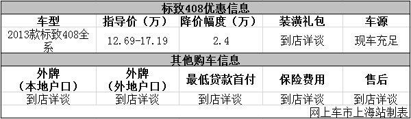 参与互动(0)日前网上车市上海站从上海冠隆4S店了解到,目前该店标致408优惠出售,详情请见下表: