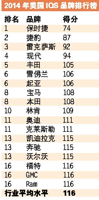 IQS是J.D.Power针对2014年2月~5月期间在美国销售超过三个月的车型,对86000名车主进行满意度调查。IQS分数反映每100辆汽车报告的故障数量,得分越低说明产品满意度越高。跟2013年每百辆新车事故率为113个相比,今年的新车故障数增加到了116个。