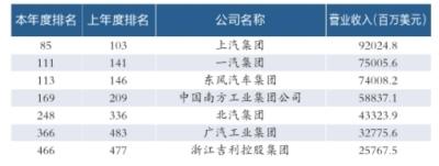 点评:虽然入围企业与去年保持一致,但入围者的排名均有不同程度的提升,其中广汽工业集团提升了117位,并首次超越浙江吉利控股集团。与此同时,上汽集团以2013年度合并报表92024.8百万美元的营业收入排名第85位,成为首位进入世界500强百强榜单的中国汽车企业。 (黄菲菲)