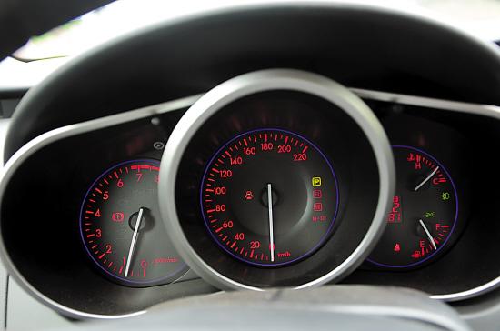 这是一个三炮筒式的仪表盘。其最大的特点是时速表、转速表在归零时,指针是指向6点钟方向的。这与许多高性能跑车的仪表盘一致,这也是马自达所乐于强调的,给予了更多运动性能车型的设计。