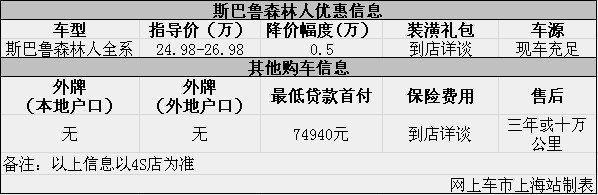 上海:斯巴鲁森林人现优惠0.5万元 现车足