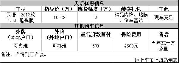 参与互动(0)日前网上车市上海站从上海弘迅汽车销售服务有限公司了解到,目前该店天语SX4优惠出售,详情请见下表: