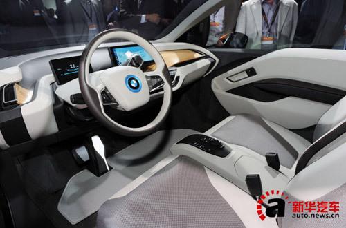中控台设计拥有极强的科技感,白色的双辐多功能方向盘样式很独特,两块液晶屏幕承担着显示车辆所有信息的任务,而中控台则保留着宝马车型的特点。采用液晶屏幕显示的“仪表盘”可显示多项车辆信息;换挡杆的造型也突破了宝马传统的设计,被设置到了方向盘的右侧,电动机启动按键以及驻车挡也被设置在了怀挡上。