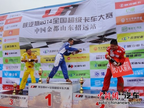 中新网7月28日电 7月21日-25日,“陕汽杯2014全国超级卡车越野大赛中国金都山东招远站”比赛激烈角逐,25日下午在台风雨水的洗礼中结束。6支车队经过16轮厮杀,最终获得前三名的车队分别是:第一名,零公里润滑油队;第二名,固铂成山轮胎车队;第三名,玲珑轮胎队。个人前三名分别是:玲珑轮胎队魏好、陕汽火箭队杨平、固铂成山轮胎队姜虎。