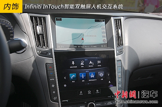 中控台的功能区配备了两块触摸式显示屏,一块主要负责信息显示,另一块多点触控式显示屏则负责完成所有的功能选择和设定。Infiniti InTouch智能双触屏人机交互系统采用革新性人机交互界面。车主可以通过智能手机下载车载配套移动APP——Infiniti InTouch,将百度地图等常用软件同步至车辆。