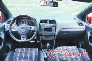 Polo是同级车唯一一款提供三个版本的车型,三版本具体是:标准版、Cross和GTI,试驾是GTI版本。与标准版相比,Polo GTI前格栅有上下两条经典的红色饰条,前灯腔熏黑,车身周围有运动型大包围,车身下方有醒目的16吋战斧轮毂和红色刹车卡钳,车尾有运动型镀铬双排气尾管。内饰为黑色,配有格纹装饰和GTI字样的运动座椅;真皮包裹的运动型方向盘以红色明线缝制,并带有镀铬处理。细致的镀铬装饰也出现在中控台,换挡手柄、手刹柄控制按钮等处,与全黑色内饰相得益彰。