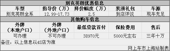 日前网上车市上海站从上海冠松别克4s店了解到,目前该店别克英朗优惠出售,详情请见下表:
