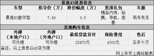 日前网上车市上海站从上海弘迅4s店了解到,目前该店景逸X3优惠出售,详情请见下表: