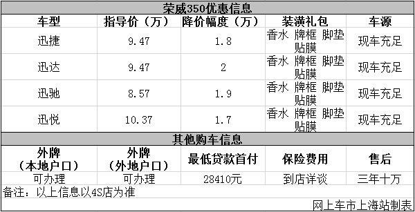 日前网上车市上海站从上海瑞孚荣威4S店了解到,目前该店荣威350优惠出售,具体信息见下表: