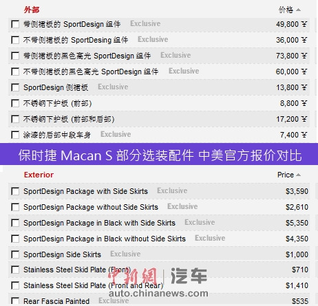 更大的价差表现在保时捷的选装部件上。保时捷车型的一大特点是其“裸车”多仅具备一些十分基础的配置,如果要拥有更加丰富的功能,就要通过加装官方选装部件来实现。而与美国市场相比,这些部件的价差更为惊人。例如,在保时捷中国官网上公布的Macan S选装部件价格列表中,“带全彩 Porsche 盾徽的车轮中心盖”的报价为人民币2700元,而其在美国报价为185美元,合人民币约1138元;“真皮内饰”中国报价为人民币75800元,美国则是5180美元,约合人民币31877元。除Macan S外,保时捷911、Cayman和Panamera等多个车型选装部件在中国的官方价格均在美国售价的2倍以上。