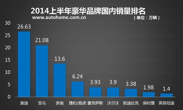 2013年,雷克萨斯的中国销量为7.3万辆,低于预期的8万辆目标,相比之下,德系三强的成绩是:奥迪,491989辆,同比增幅21.2%,宝马,362100辆,同比增幅19.4%,奔驰,218045辆,同比增幅11.1%。