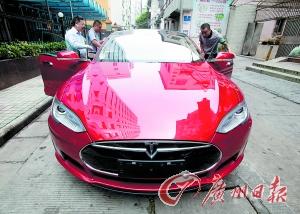 刘先生耗资90多万元购买了一辆纯电动跑车特斯拉,但却得知特斯拉在广州不能直接上新能源汽车牌照。记者庄小龙 摄