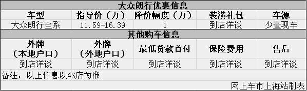 日前网上车市上海站从上海锦江4s店了解到,目前该店大众朗行优惠出售,详情请见下表:
