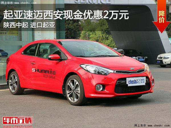 近日,据网上车市西安分站编辑从陕西中起进口起亚4S店获悉,起亚--速迈现金优惠2.0万元,(市场行情随时在变,具体优惠请以展厅报价为主),少量现车,有意者不妨致电经销商或者到店了解更多信息。详情以及更多优惠请致电4008-112-233转2968。